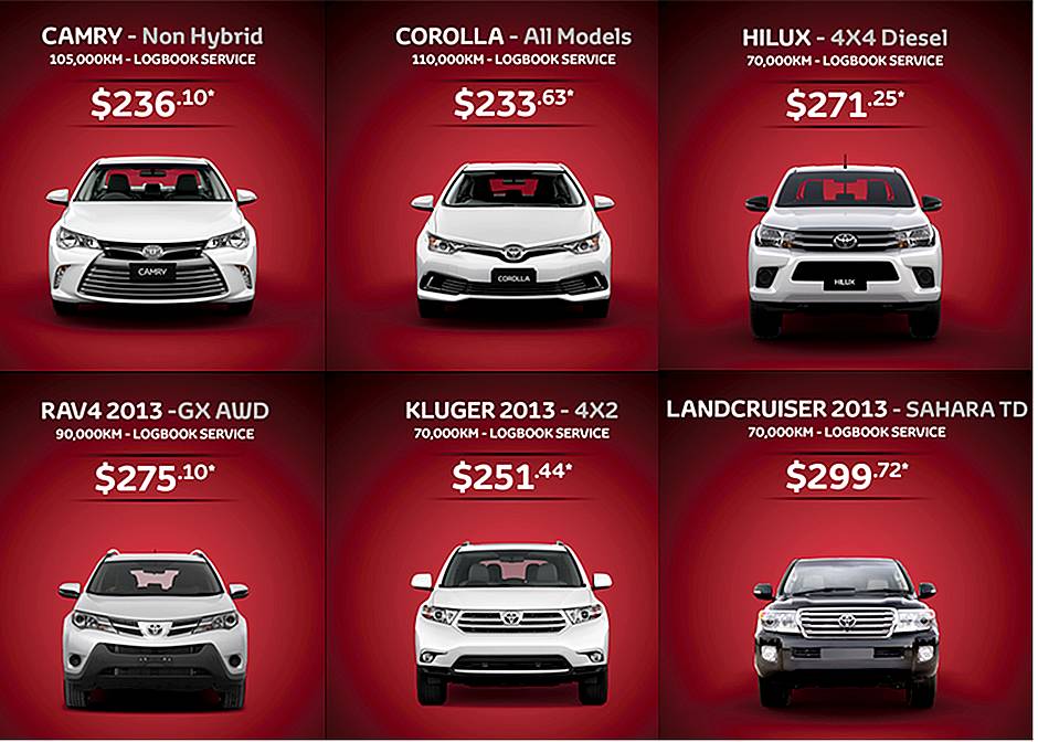 Here are some examples of servicing prices under the Toyota Service Guarantee.