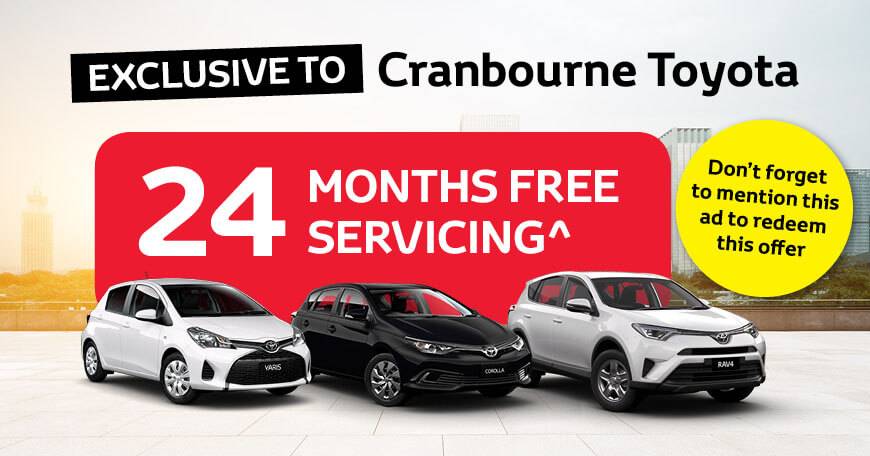 *2 years free servicing offer is valid on new Yaris, Corolla and RAV4 models in stock at current factory driveaway price. Applicable for the 6mth/10,000kms, 12mth/20,000kms, 18mth/30,000kms and 24mth/40,000kms paid Toyota Service Advantage scheduled services only, additional parts extra. Offer applicable for Private, Bronze and Silver fleet customers, and primary producers. Offer available while stocks last. See in store for more details.